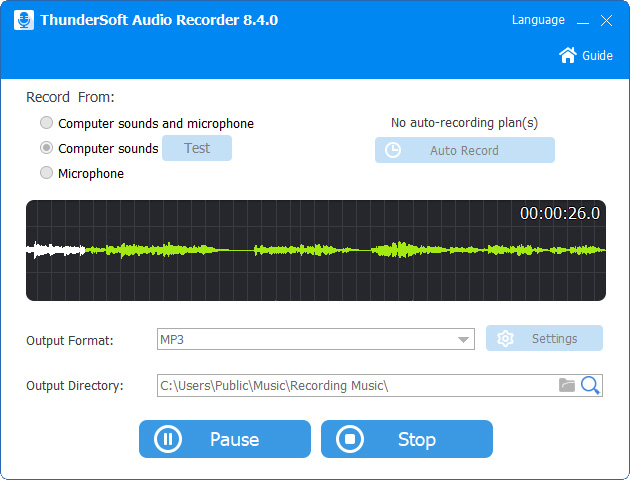 ThunderSoft Audio Recorder is a handy tool to record sound from both computer and microphone. Supports various audio sources, streaming music, in-game sound, Skype, voice chat, etc. Easy to use with simple "Record", "Pause" and "Stop" buttons, and high quality output result which can playback on any music player or portable devices. This software also contains powerful auto recording feature and other useful settings to help you make recording schedule.