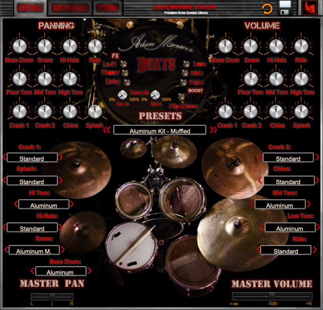 The VST, AU, and AAX versions include the ability to mix and match kits, save user kits, adjust note assignments, adjust what part of the cymbals get triggered, as well as toggle automatic left/right hits. Effects include reverb, lofi, chorus, stereo-flip, delay, and eq switches. Individual parts of the drum kit can be panned and volume adjusted within the plugin, or can be routed to individual outputs in your DAW. There is an extensive Midi Library browser where drum loops can be previewed and drag-dropped into your DAW.