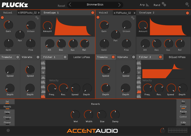PLUCKz ships with over 60 different meticulously designed and sampled pluck sounds, so you can mix and match these in any combination in the two voice playback system. Each of the two voices in PLUCKz features: