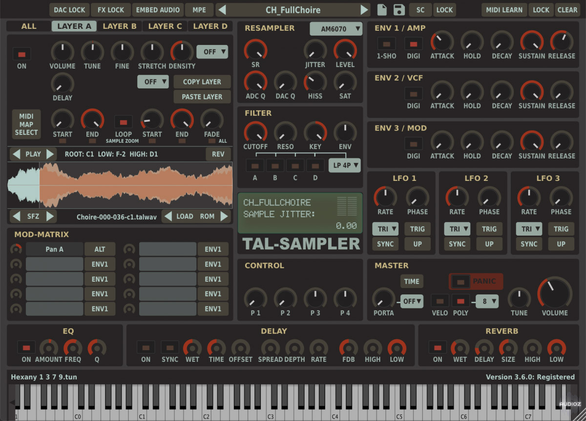 TAL-Sampler 不仅仅是一个采样播放器。它是一个功能齐全的模拟建模合成器,以采样器引擎作为声源,包括强大的调制矩阵和高质量的自振荡 24/12/6 dB 低通滤波器。