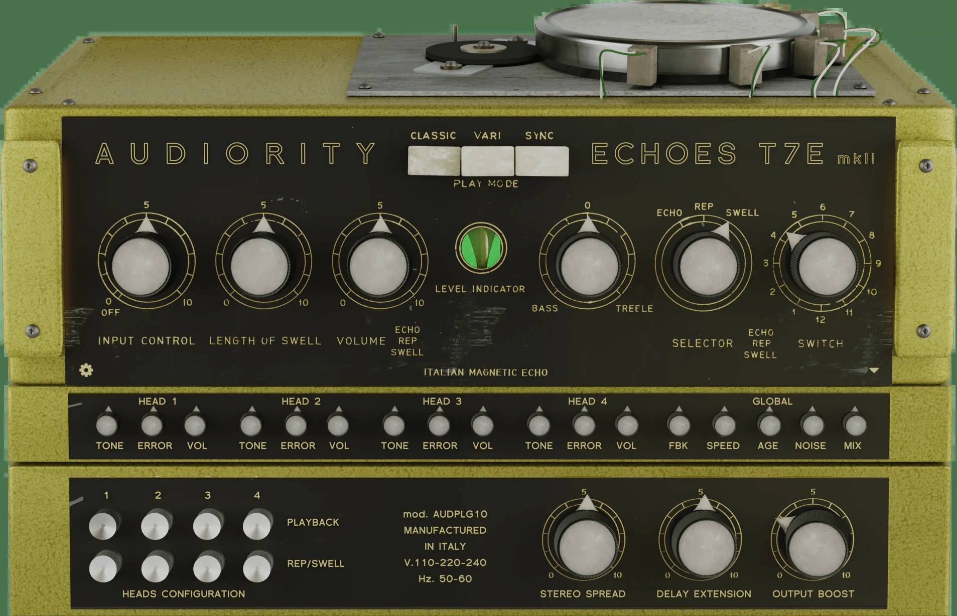 Since the main “core” of this effect is based on the above mechanism, we modelled both the mechanics and the electronics. Echoes T7E also provides 3 different playback modes allowing you to set different spinning speed or ever synchronize it to your host tempo extending the original delay length from ~310ms up to ~11s or down to 0ms, allowing you to use the plugin as a preamplifier.